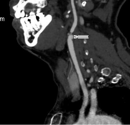圖1 箭頭所示左頸動脈線樣狹窄