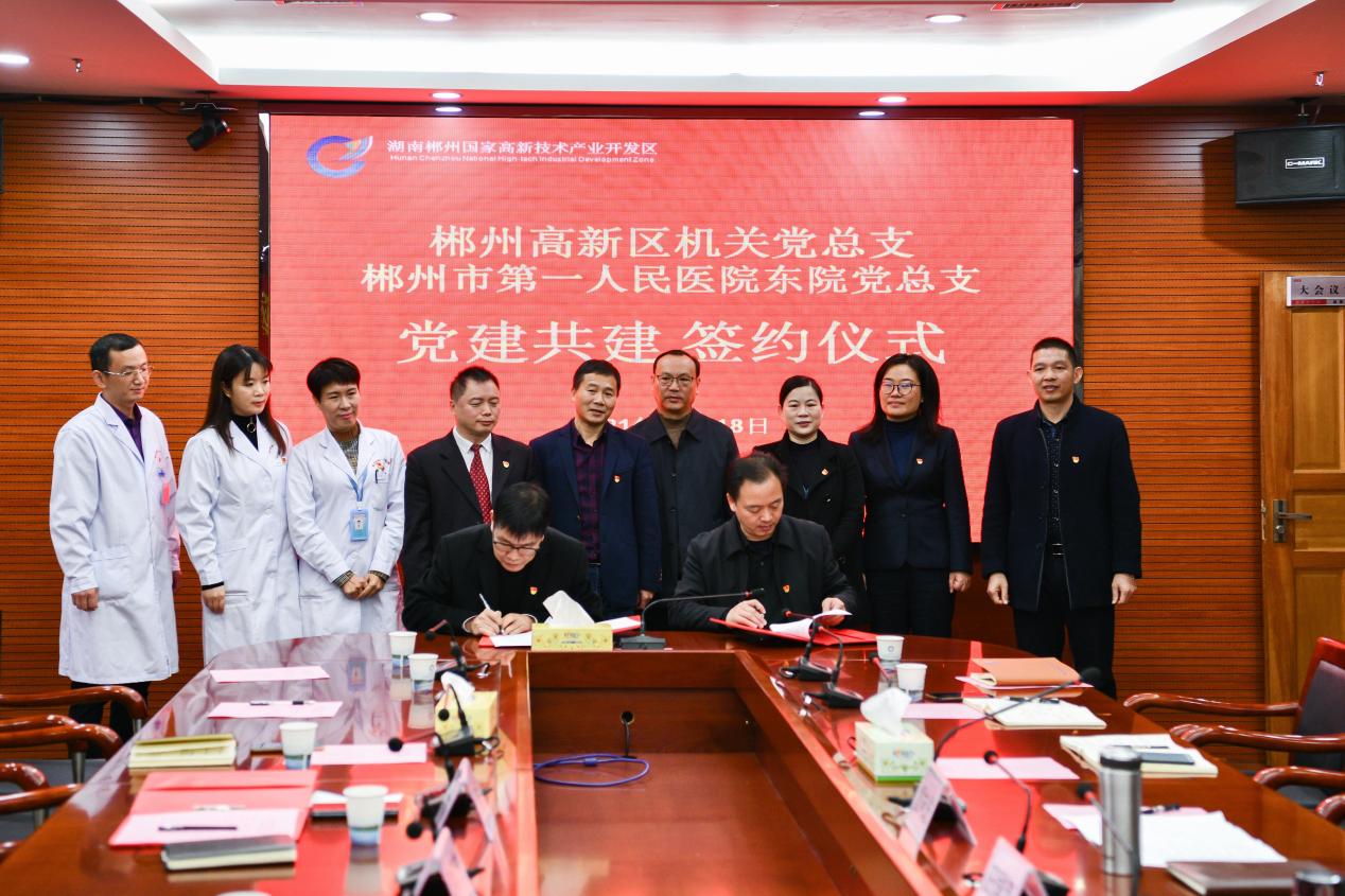 儀式由高新區(qū)黨工委副書記雷向進主持。郴州市第一人民醫(yī)院東院黨總支書記徐有望、高新區(qū)管委會機關(guān)總支書記田國海作為雙方代表簽訂“黨建共建”協(xié)議書。