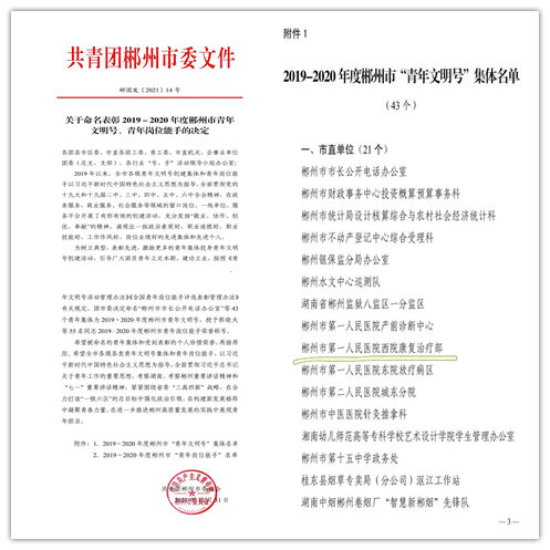 近日,共青團(tuán)郴州市委員會(huì)下發(fā)《關(guān)于命名表彰2019-2020年度郴州市青年文明號(hào)、青年崗位能手的決定》(郴團(tuán)發(fā)〔2021〕14號(hào))文件,郴州市第一人民醫(yī)院西院康復(fù)治療部被授予2019-2020年度“郴州市青年文明號(hào)”榮譽(yù)稱號(hào)。