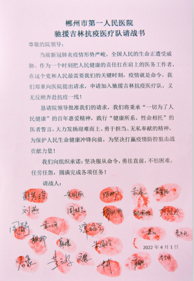 “我們將秉承‘一切為了人民健康’的百年惠愛(ài)精神,為保護(hù)人民生命健康沖鋒向前,為堅(jiān)決打贏疫情防控狙擊戰(zhàn)貢獻(xiàn)力量!” 4月1日上午,郴州市第一人民醫(yī)院在后勤綜合樓517會(huì)議室舉行了馳援吉林醫(yī)療隊(duì)出征儀式,25名志愿者在請(qǐng)戰(zhàn)書(shū)上按下手印,帶著全市人民的期盼和對(duì)家人的不舍,即將北上抗疫。他們將按照省、市新冠肺炎疫情防控指揮部醫(yī)療救治組的安排和部署,奔赴吉林,共同戰(zhàn)疫!