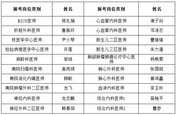 經(jīng)考試考核,擬錄取以下考生為我院工作人員: ?此公告公示七天。請以上考生務必于5月4日早上7:30攜帶本人身份證及體檢費300元至我院南院體檢中心統(tǒng)一集合體檢。應屆考生于2016年5月10日前至醫(yī)院人力資源部簽訂就業(yè)協(xié)議。???????????????????????????????????????????????????????????? 特此公告。 ? 郴州市第一人民醫(yī)院 2016年4月27日 |