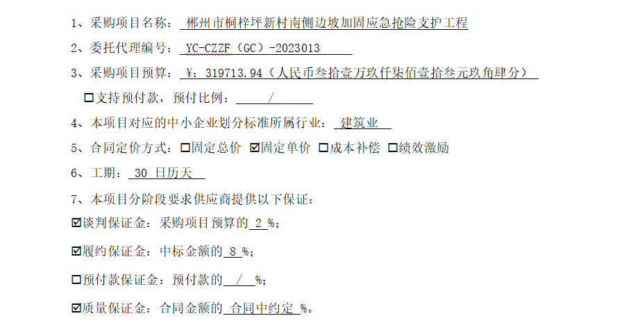郴州市第一人民醫(yī)院的郴州市桐梓坪新村南側(cè)邊坡加固應急搶險支護工程進行競爭性磋商采購,現(xiàn)采用發(fā)布公告方式,邀請符合資格條件的供應商參與競爭性磋商采購活動。