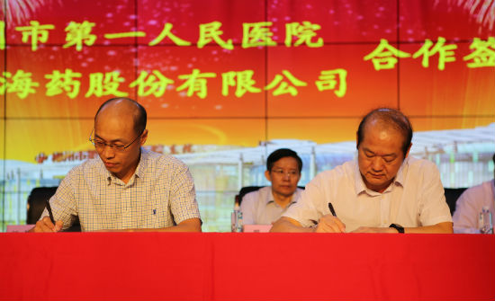 郴州市第一人民醫(yī)院院長黃仁彬(右)、海南海藥股份有限責(zé)任公司總經(jīng)理任榮(左)在合作協(xié)議上簽字