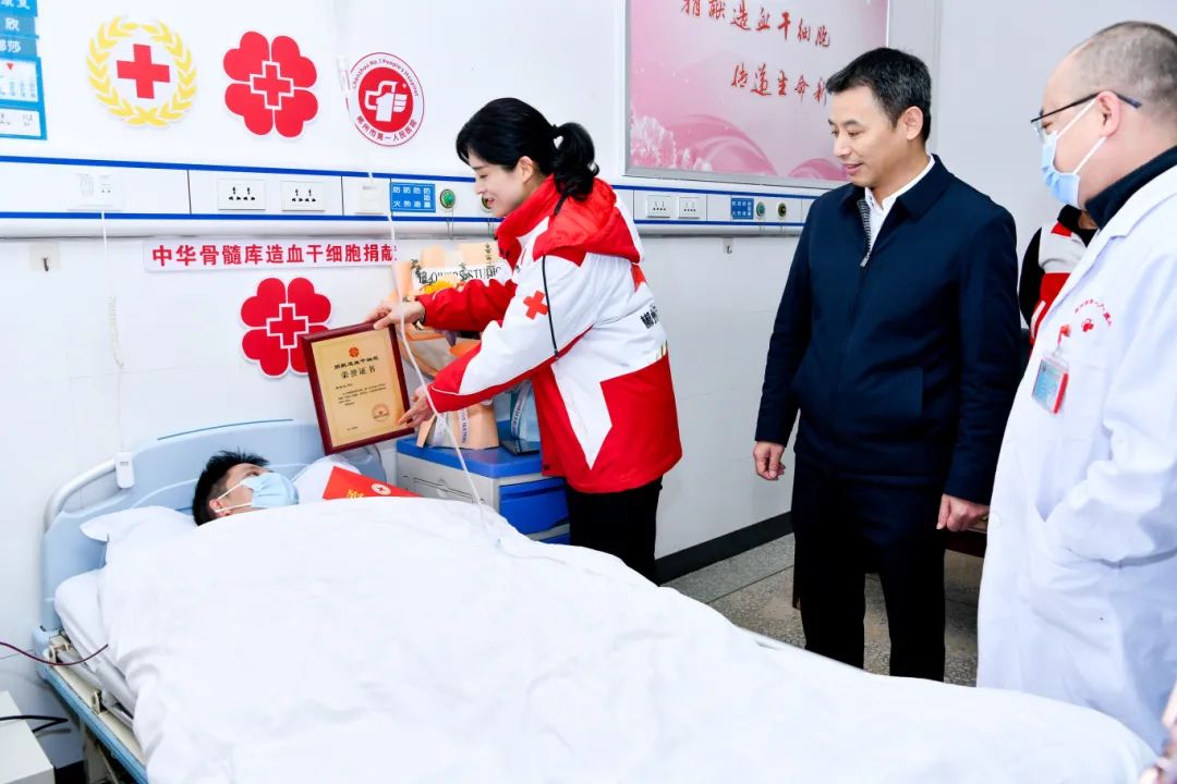 當日,郴州市人民政府副市長楊平,郴州市第一人民醫(yī)院院長方力,郴州市紅十字會黨支部書記、專職副會長曹鵑宇來到造血干細胞采集現(xiàn)場看望和慰問陳奇龍,向他獻上鮮花和慰問金,為他頒發(fā)榮譽證書,并對他的大愛行為給予了高度肯定。