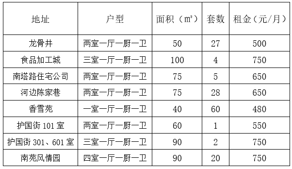 一、本次擬開(kāi)放租賃的房源共計(jì)147套,房源具體分布在龍骨井、食品加工城、南塔路住宅公司、河邊陳家巷、香雪苑一期區(qū)域、護(hù)國(guó)街區(qū)域、湘南風(fēng)情康居園。(過(guò)渡房?jī)?nèi)家具家電需承租人自備。)