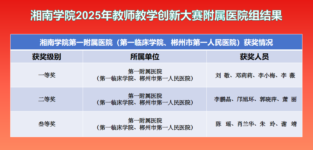 2025年6月24日,在2025年湘南學院普通高校教師教學創(chuàng)新大賽(附屬醫(yī)院組)的舞臺上,郴州市第一人民醫(yī)院(湘南學院第一臨床學院)三個教研室大放異彩(兒科教研室榮獲一等獎,護理教研室斬獲二等獎,婦產(chǎn)科教研室榮獲三等獎)。這一佳績不僅是對參賽教研室教學創(chuàng)新成果的肯定,更為全院教學改革注入了強勁動力。