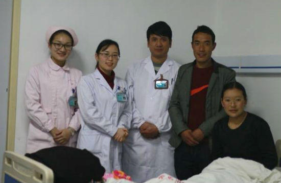 主管醫(yī)生何文娟(左二)、進修藏族醫(yī)生旦增(左三)與索朗曲珍姐弟合影