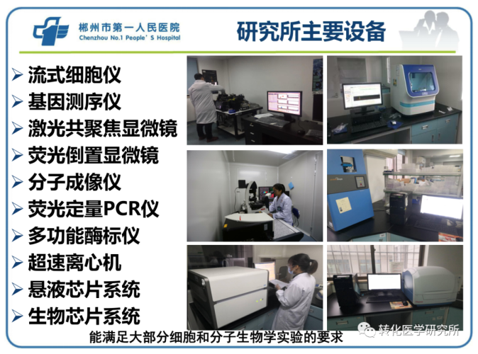 研究所成立至今已經(jīng)建設(shè)了較高水平的科研硬件設(shè)施和科研平臺。具備了開展分子生物學(xué)和細(xì)胞生物學(xué)實驗的基本儀器和設(shè)備,包括流式細(xì)胞分選儀、熒光定量pcr儀、多功能酶標(biāo)儀、超速冷凍離心機、高速離心機、蛋白純化儀、激光共聚焦顯微鏡、熒光顯微鏡等及建有臨床樣本庫、細(xì)胞培養(yǎng)間、標(biāo)準(zhǔn)pcr實驗室、p2級實驗室等設(shè)施。研究所建有“高通量分子診斷技術(shù)國家地方聯(lián)合工程實驗室”、“醫(yī)學(xué)分子診斷技術(shù)湖南省工程實驗室”等國家和省級高水平科研平臺以及湖南省博士后流動站協(xié)作研發(fā)中心、湖南省博士后創(chuàng)新創(chuàng)業(yè)實踐基地等省級人才培養(yǎng)平臺,正逐步成為郴州市乃至湖南省生物醫(yī)學(xué)研究的重要場所。