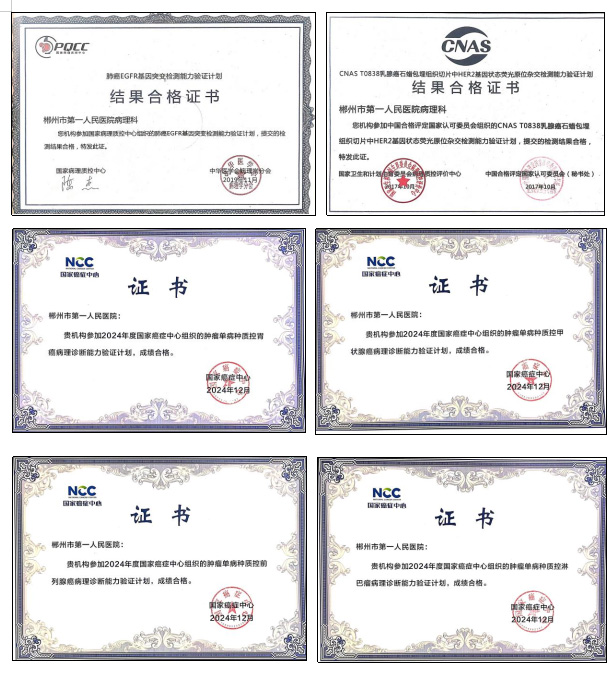 2017-2019年參加國(guó)家病理質(zhì)控中心肺癌egfr基因突變檢測(cè)、her2基因fish檢測(cè)室間質(zhì)評(píng)合格;歷年參加湖南省臨床病理質(zhì)控中心免疫組化室間質(zhì)評(píng)合格率為100%;2017-2018年榮獲湖南省臨床病理質(zhì)控中心先進(jìn)單位;近兩年相繼通過(guò)國(guó)家癌癥中心的肺癌、乳腺癌、甲狀腺癌、胃癌、淋巴瘤、前列腺癌診斷能力認(rèn)證計(jì)劃項(xiàng)目。